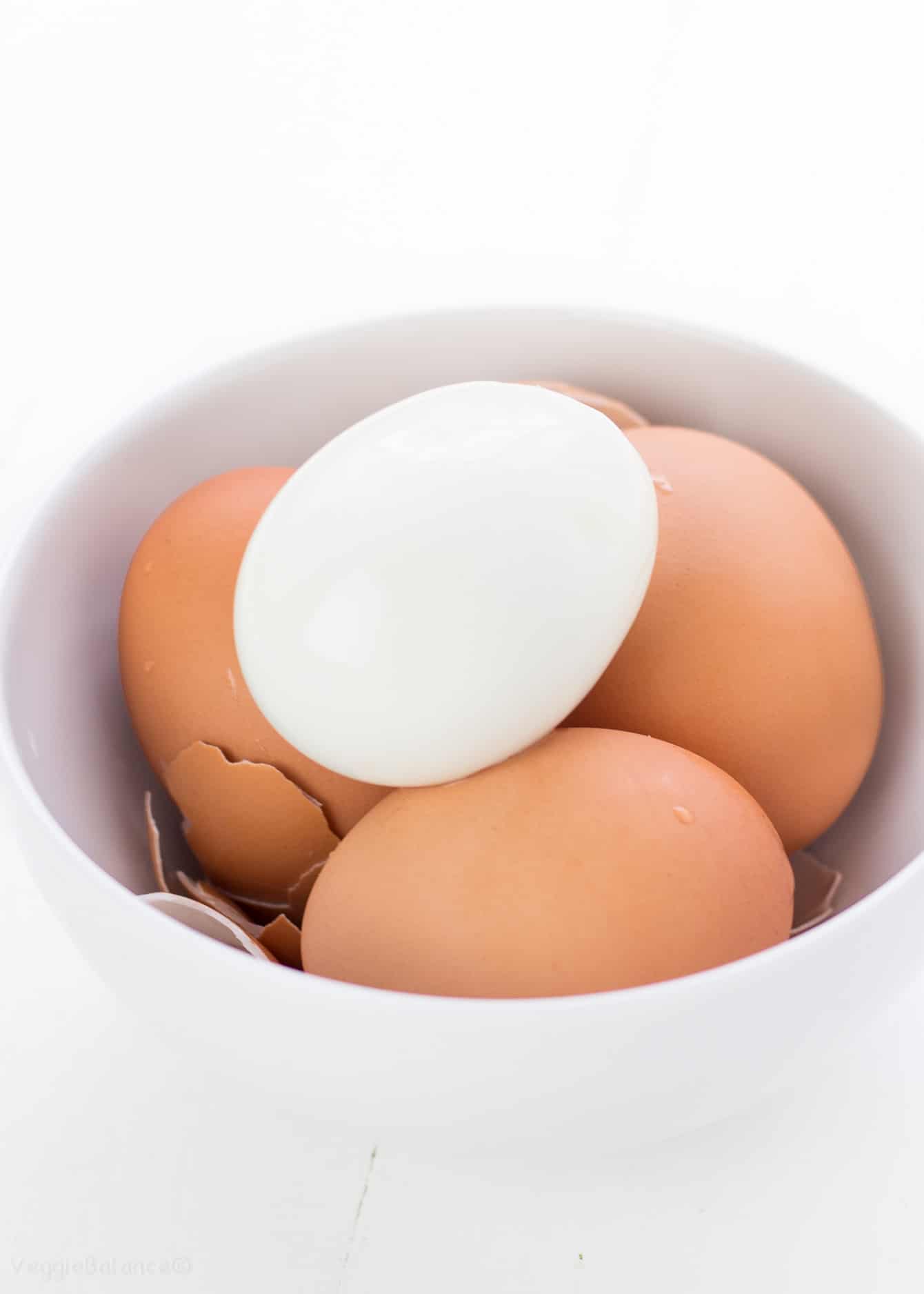 Peeling in the water surprisingly has a huge impact on how well they peel. Don’t skip this step. Keep dunking them into the water over and over again while peeling. The water gets in between the membrane and the shell slides right off.