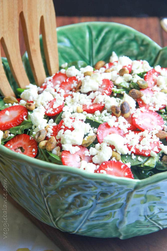 Fresh juicy strawberries topped on a bed of spinach, feta cheese and pistachios to begin with is sweet salad heaven. Toss that all together with a balsamic vinaigrette and man it’s to die for. So delicious you seriously forget it’s healthy and good for you.